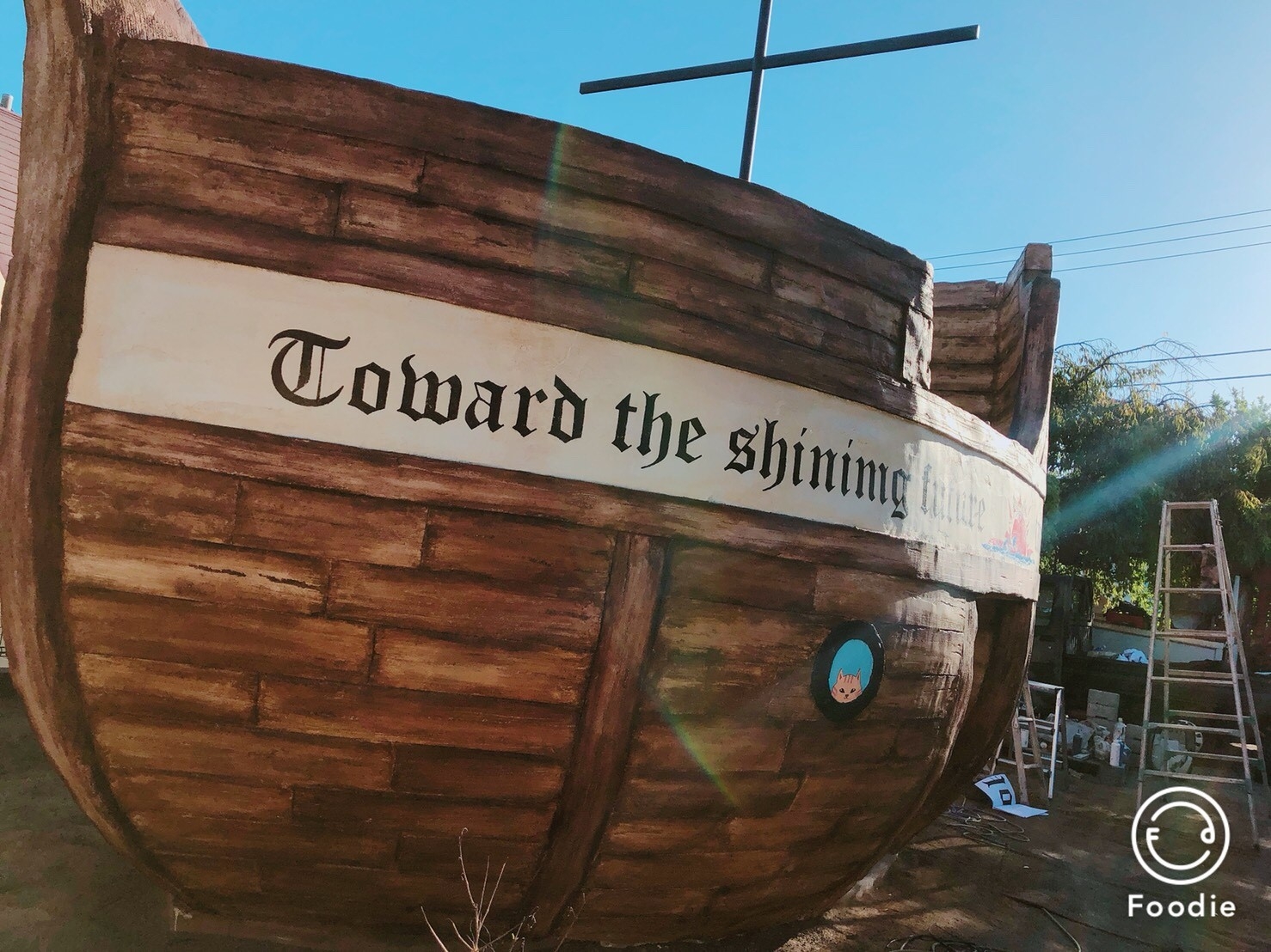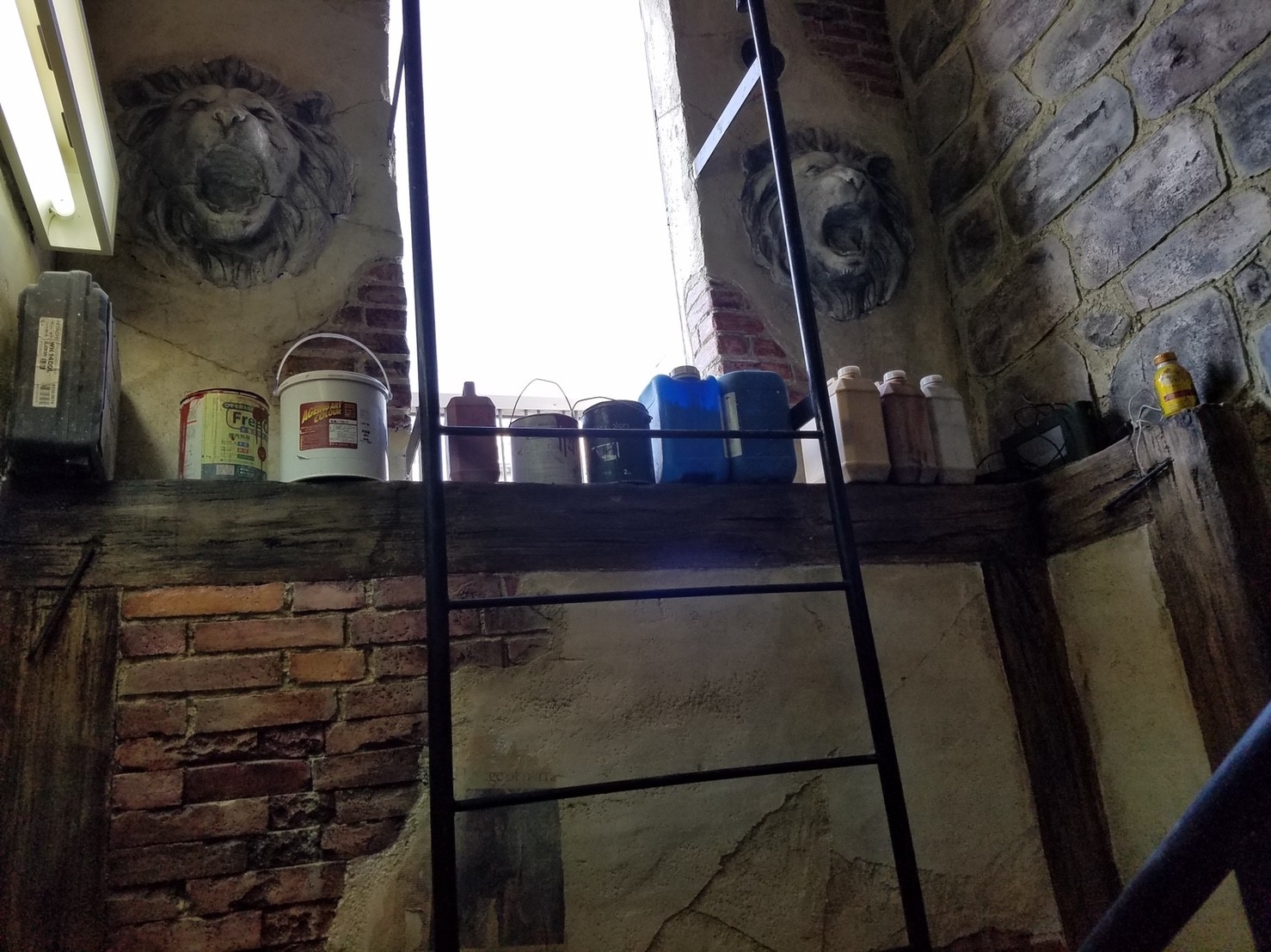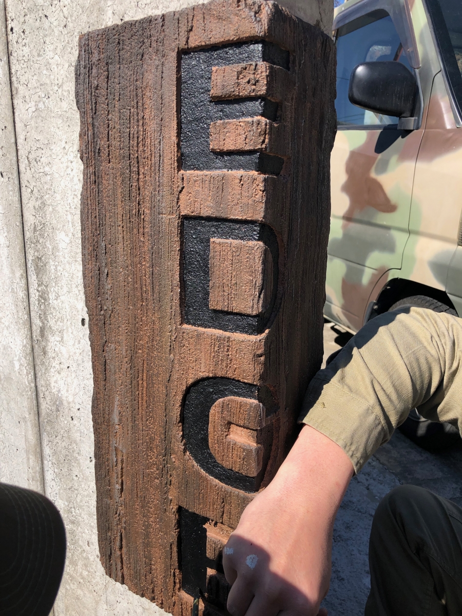 ステップ5:いよいよ塗装です。遊びなので木の板ぽっく文字は黒くしました。注目はコンクリートの壁のリペア部分の一体化!最初の写真から比べると同化しているよね!